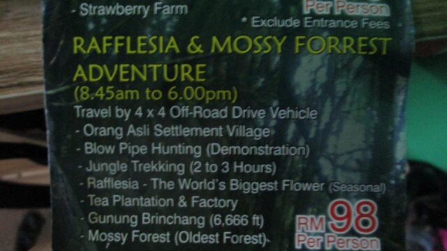We stayed in a lovely hostel called Orchid Haven and booked a great tour directly from there (pics & names of tour flyer), which took us on an all day trip through the tea fields, the BOH tea factory, the mossy forest and to during a light trekking tour to finally see the Rafflesia (another thing of the bucket list! Yeah!)