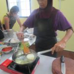 We were going to cook 5 different dishes (list of dishes here) and each of us would cook the whole recipe by themselves after the two chefs showed us how to cook each one of them. It was so much fun to first watch the two lovely Malay & Indonesian women cook the recipe and then go back to our own cooking station to do each step by ourselves. Nothing was pre-cut or pre-cooked and we were able to adjust all recipes according to our own taste, which meant instead of having 5 times the identical 5 dishes, we ended up with 25 different dishes at the end!